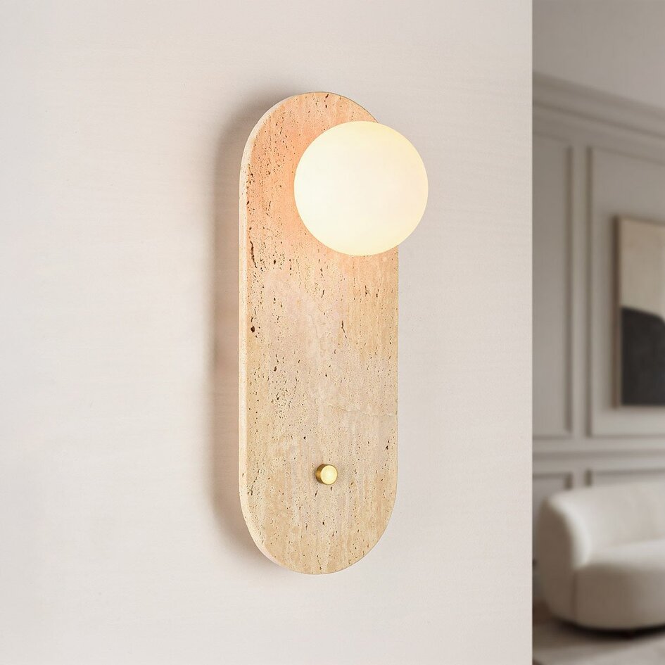 Les lignes douces et les textures naturelles se marient dans l'applique murale Onda. La plaque murale allongée en travertin forme une base apaisante, tandis que la boule en verre assure une diffusion uniforme et agréable de la lumière. Le subtil détail doré confère à la lampe une finition raffinée sans dominer son aspect naturel. Onda est équipée d'une douille G9 (source lumineuse non incluse) et trouve parfaitement sa place dans une chambre, un couloir ou à côté d'un miroir où un éclairage d'accentuation chaleureux est souhaité.
