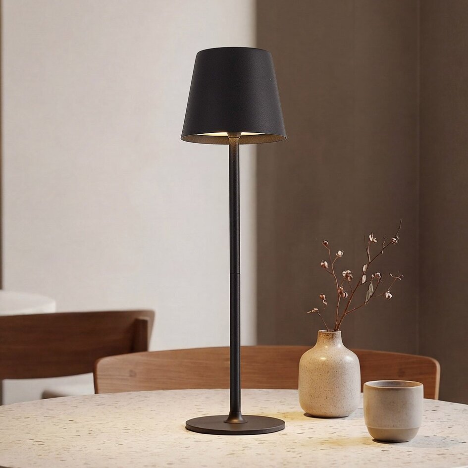 La lampe est sans fil et équipée d'une batterie rechargeable, ce qui vous permet de la placer facilement n'importe où. Grâce à son design réglable et à ses deux parties distinctes, vous pouvez facilement ajuster la hauteur de 38 cm à 24 cm. Avec la commande tactile située sur le dessus de l'abat-jour, vous allumez et éteignez la lampe, basculez entre trois couleurs de lumière (3000K, 4000K et 6500K) et réglez l'intensité lumineuse en continu en maintenant le bouton enfoncé plus longtemps. Chargez complètement la lampe avant la première utilisation (environ 4 heures). Le chargement s'effectue via le câble USB de 50 cm fourni.